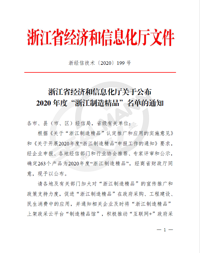 伏尔肯入选浙江制造精品企业 2021-01-11