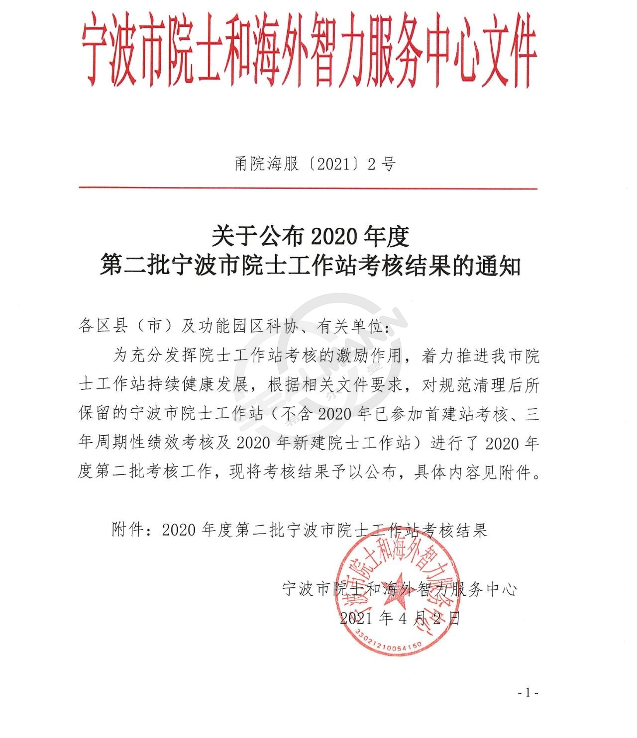 从宁波市院士和海外智力服务中心获悉,球友会院士工作站经2020年度第二批宁波市院士工作站绩效评审,考核结果为优秀。