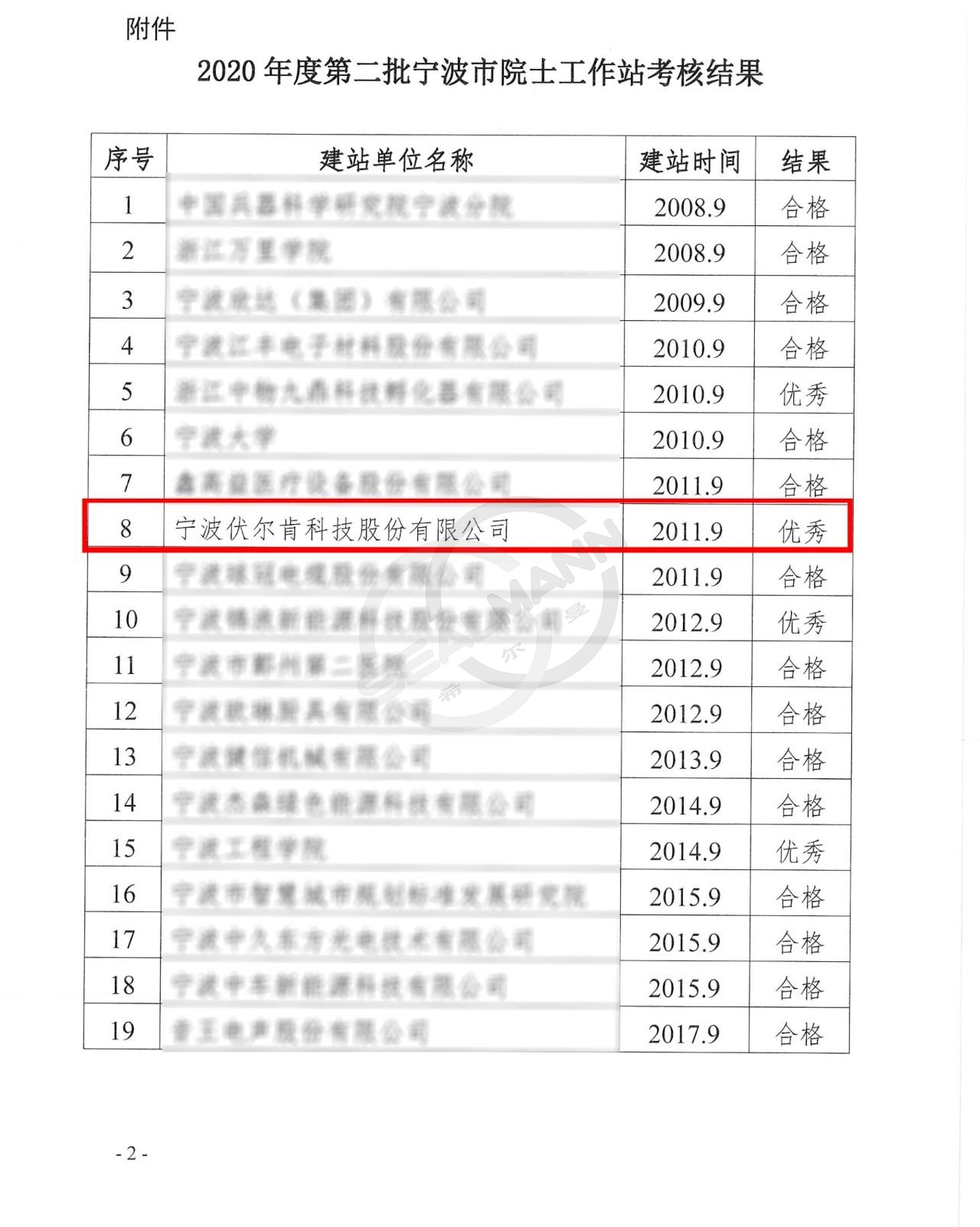 2011年伏尔肯经批准设立宁波市院士工作站,2012年被认定为浙江省院士(专家)工作站,2017年荣获国家级示范院士专家工作站。