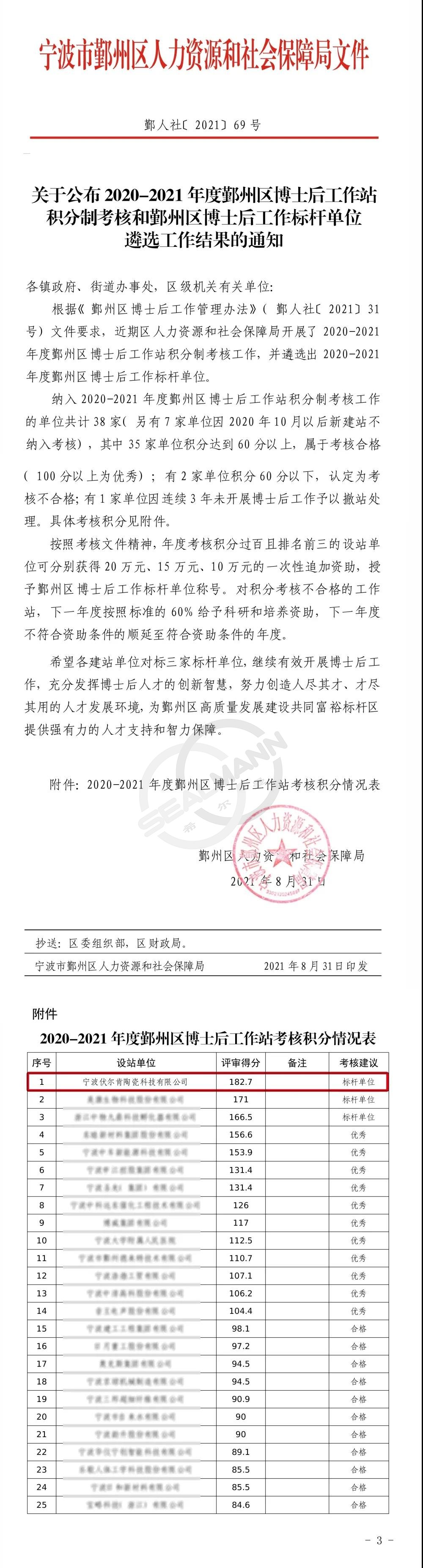 从宁波市鄞州区人力资源和社会保障局获悉,伏尔肯博士后工作站通过积分制考核,评审得分第一,连续两年被遴选为鄞州区博士后工作标杆单位。