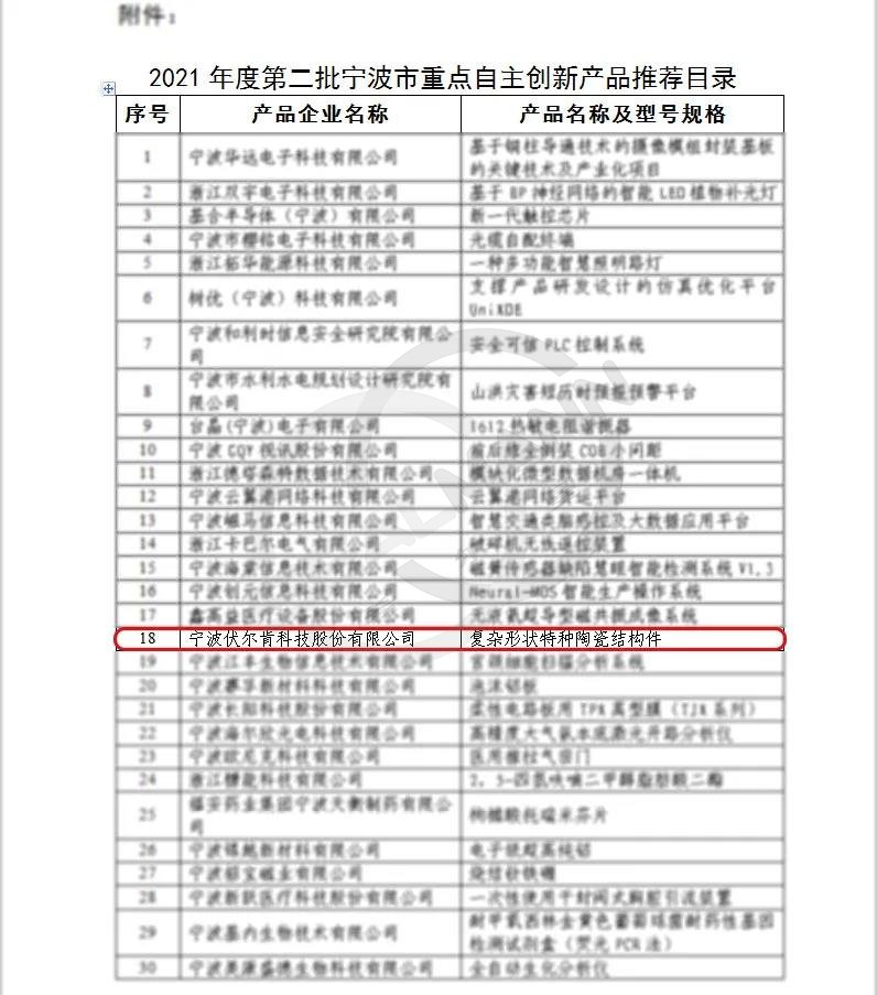 近日,在宁波市科技局获悉,我司的“复杂形状特种陶瓷结构件”成功入选2021年度宁波市重点自主创新产品推荐目录,这是市科技局对我司自主创新技术和产品的认可。