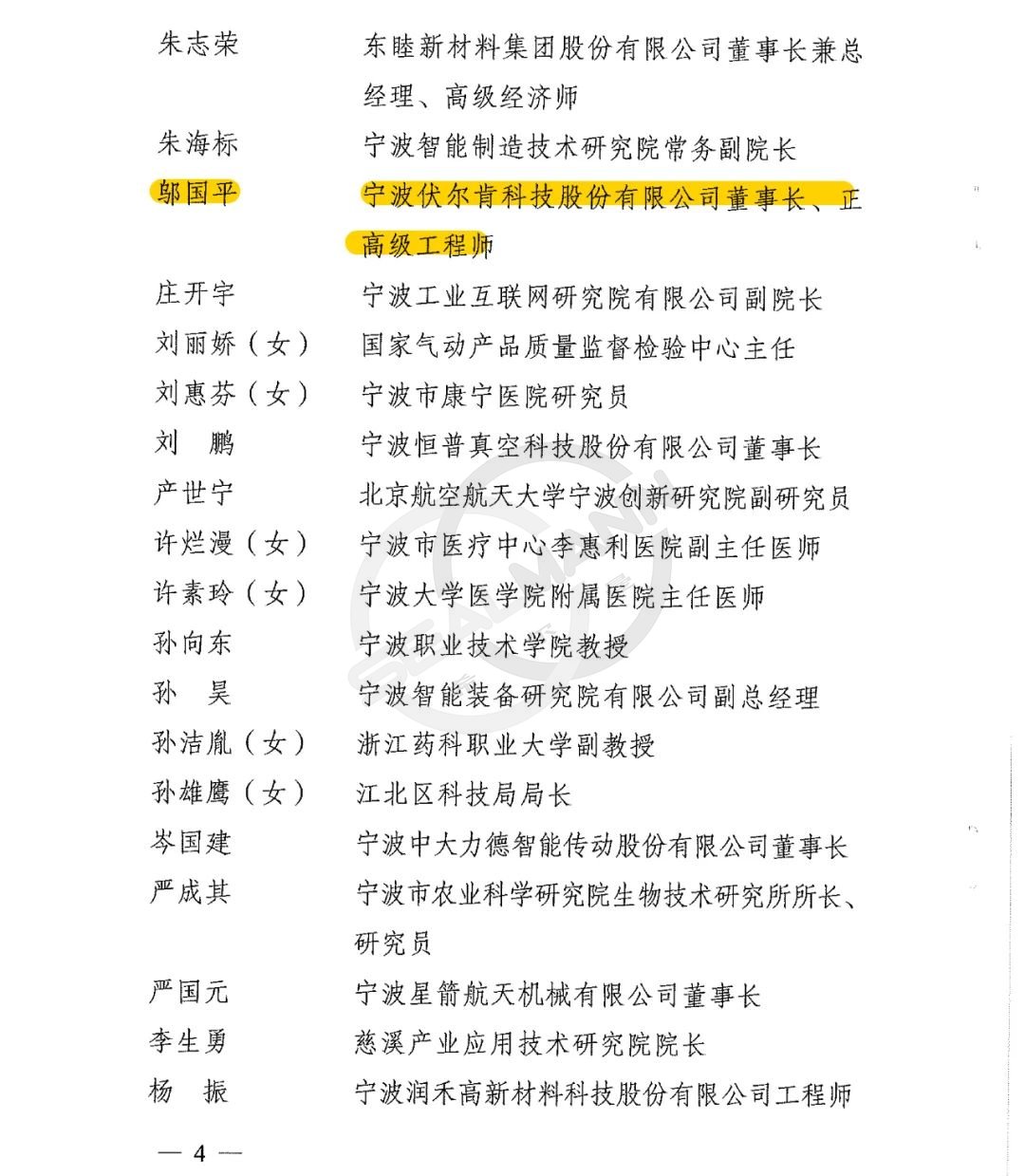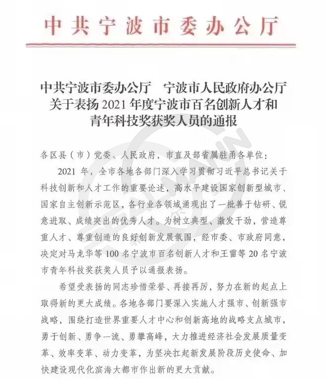 日前,从宁波市委办公厅、宁波市人民政府办公厅发布获悉,通报表扬了2021年度市科技创新工作优秀人才,我司董事长、总经理邬国平被授予“宁波市百名创新人才”。